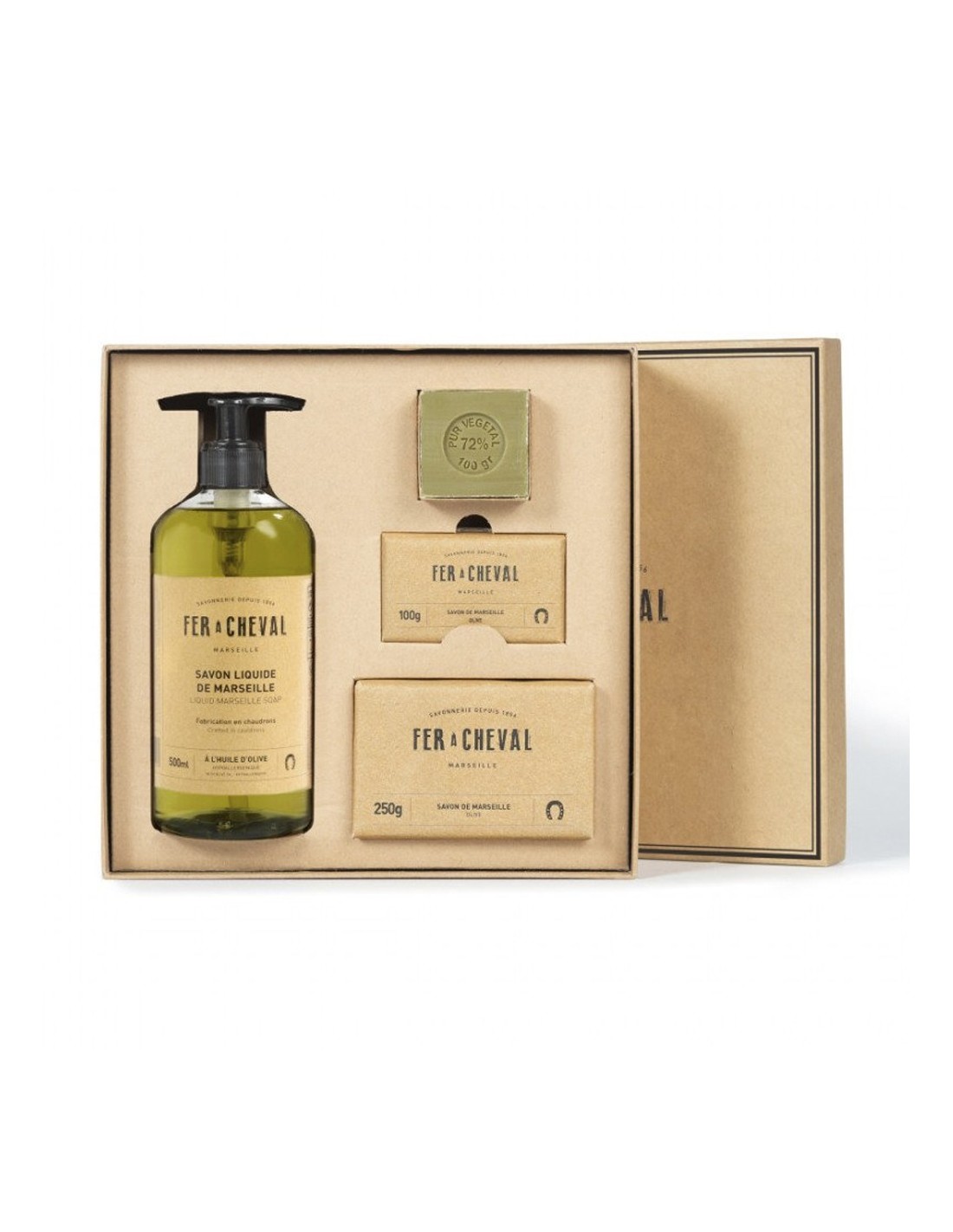 La fábrica de jabón Fer à Cheval le ofrece una caja de regalo de su aroma a jabón de Marsella de aceite de oliva en todos sus formatos.
